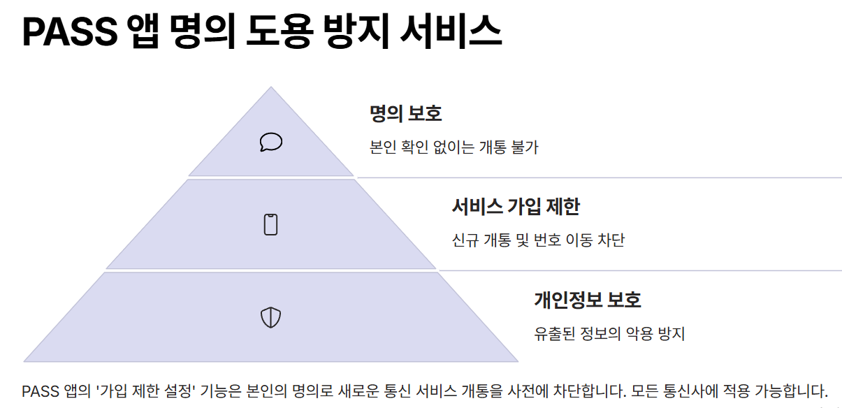 PASS 앱에서 '가입 제한 설정'을 통해 타인이 내 명의로 통신 서비스 개통을 시도하는 것을 사전에 막을 수 있습니다. SKT, KT, LGU+ 모두 지원되며, 유출된 신분증, 주민번호 등의 악용 가능성을 근본적으로 차단하는 효과적인 보안 수단입니다.